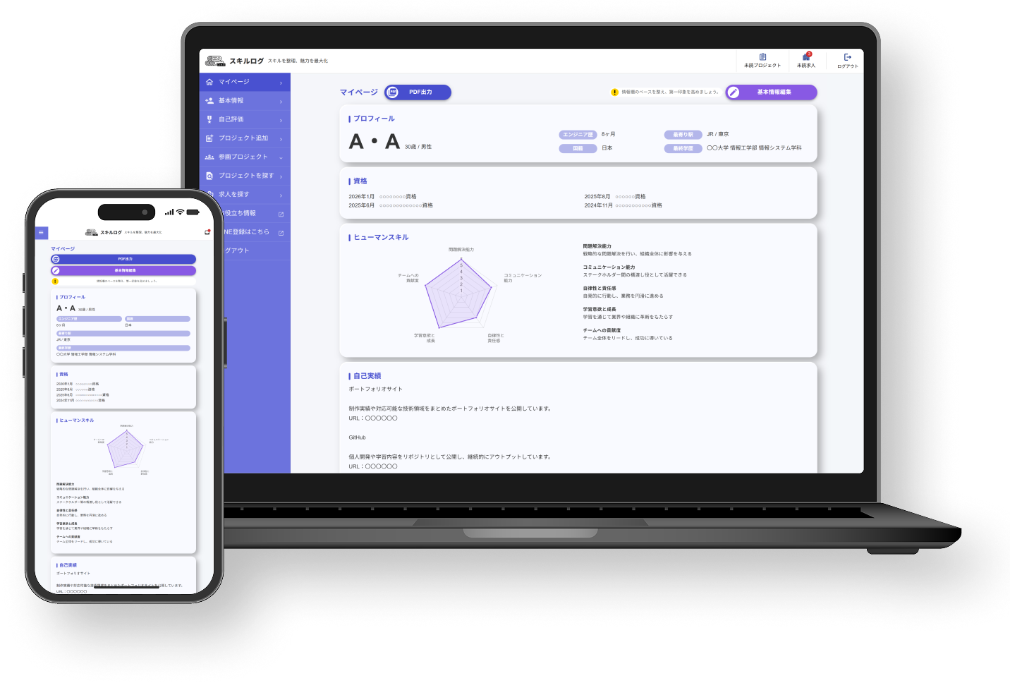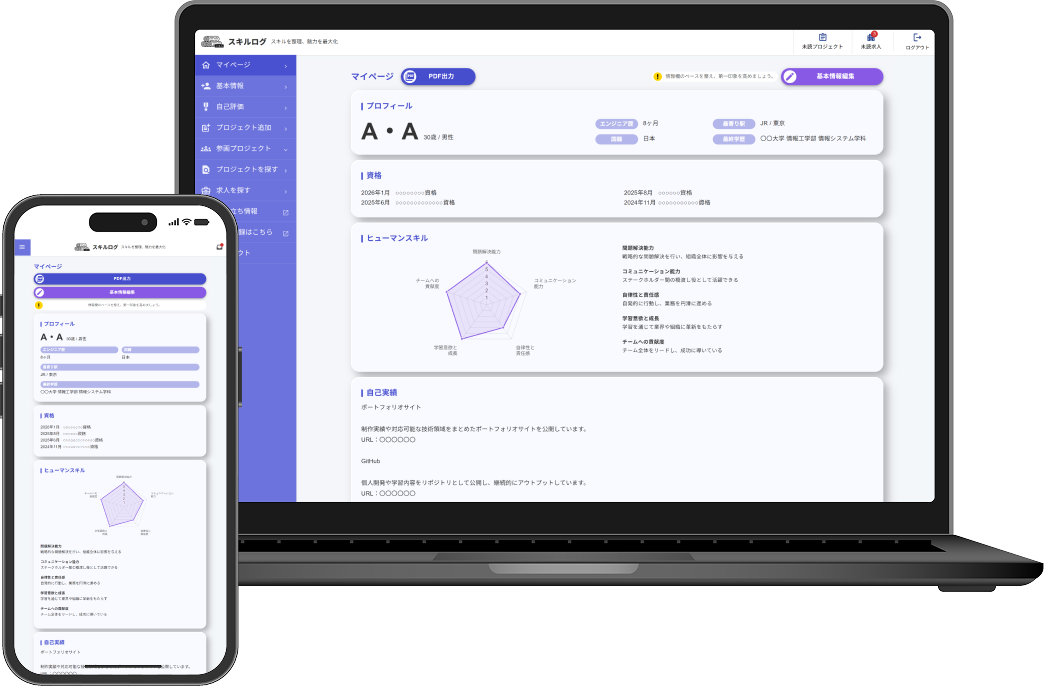 スキルログはPC・スマホ・タブレットに対応しており、クラウド管理でどこでも編集可能です。 移動中でも手軽にスキルシートの作成・更新ができます。 今すぐ登録して、エンジニアとしてのキャリアを強化しましょう!