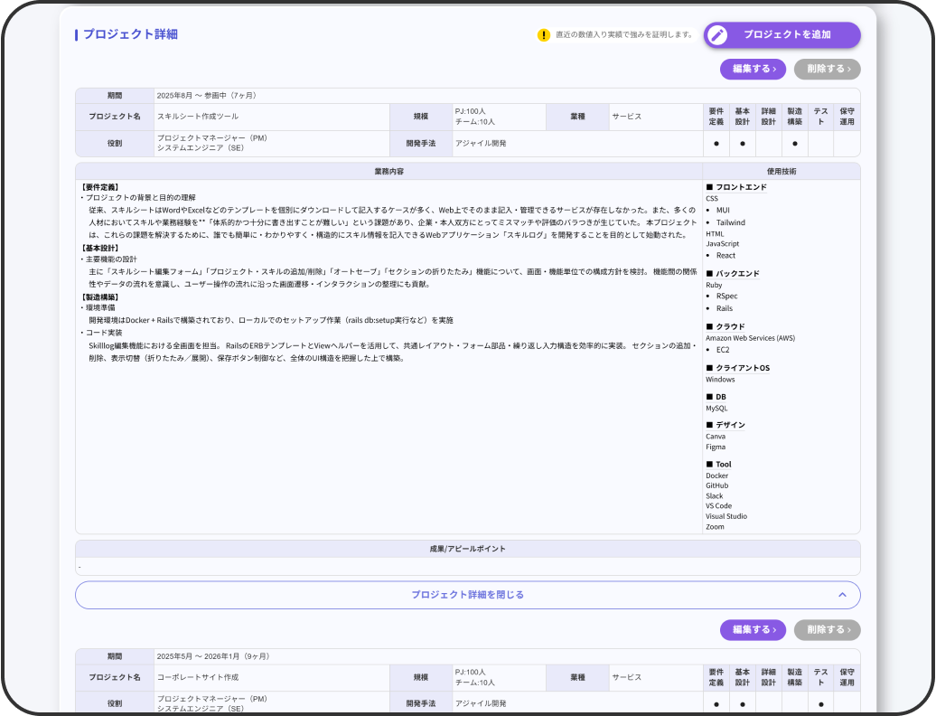 スキルログ上で作成したスキルシートを使って、プロジェクトや求人にすぐ応募できます。 スキルシート作成からプロジェクト・求人への応募までスキルログひとつで完結!