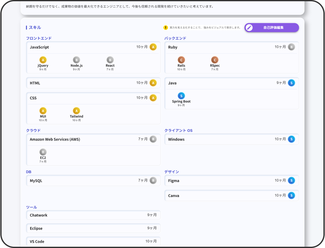 フリーランスエンジニア、転職活動中の方、スキルを整理したい現役エンジニアなど、幅広い層のエンジニアが利用しています。